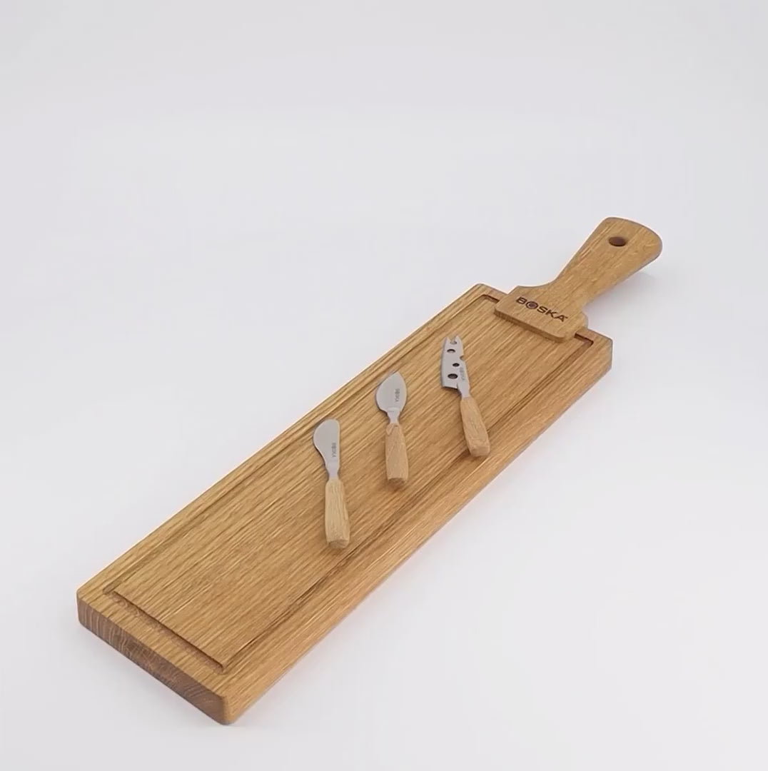 Settið inniheldur fallegt viðarbretti úr evrópskri eik og þrjá hágæða ostahnífa úr ryðfríu stáli. Hnífarnir henta fyrir allar gerðir af ostum, mjúka og harða.