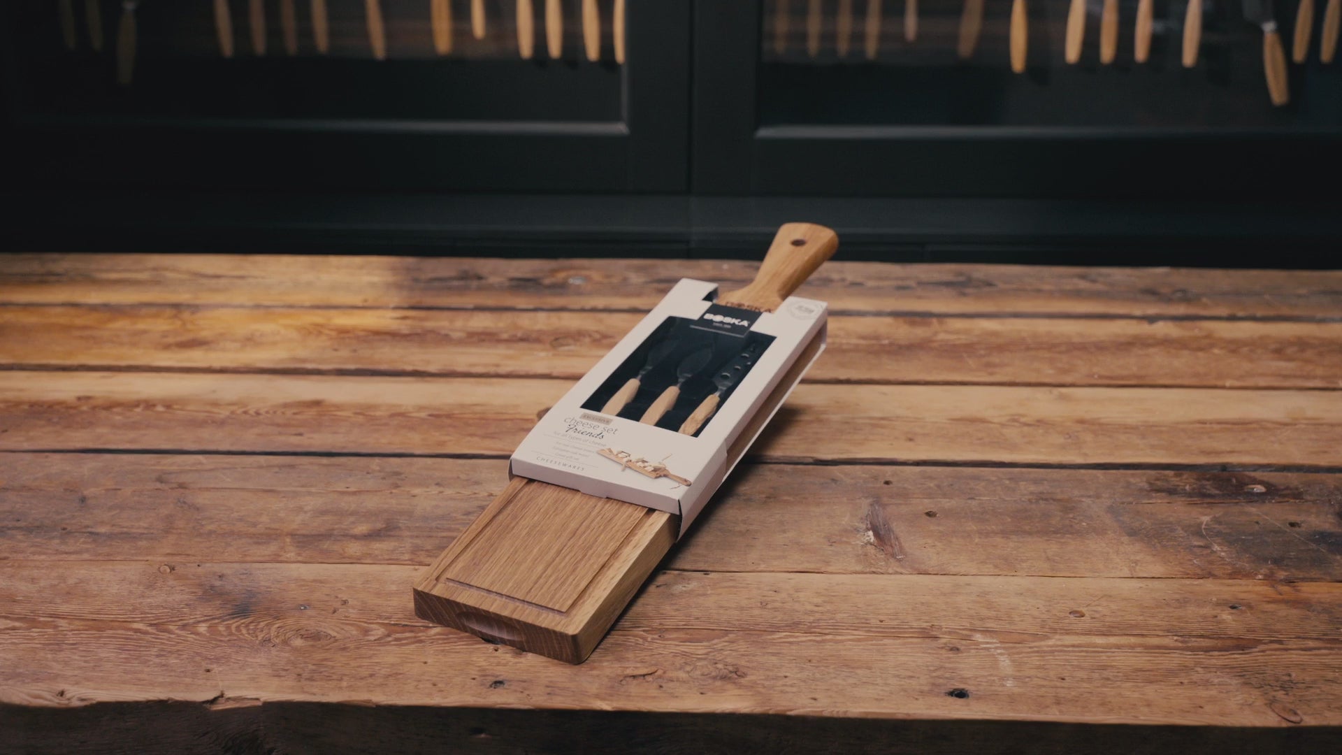 Ostahnífasett Friends – viðarbretti úr eik með þremur ostahnífum