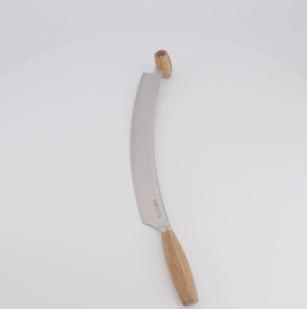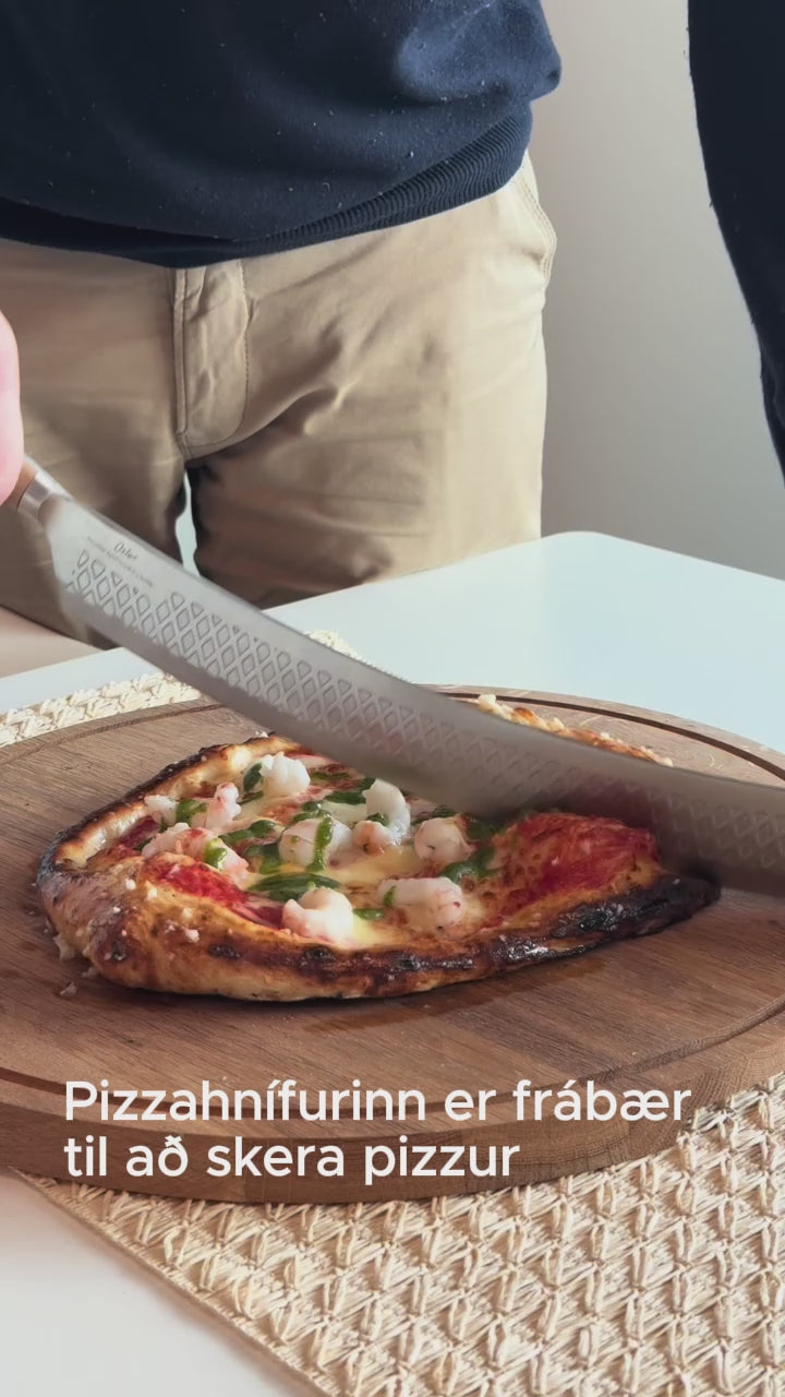 Pizzahnífurinn er frábær til að skera pizzur en helsti kosturinn sem hann hefur í för með sér er að þú ýtir ekki álegginu eins og er oft tilfellið með ostahjólin. Hann er þægilegur í notkun og það tekur enga stund að skera pizzuna.